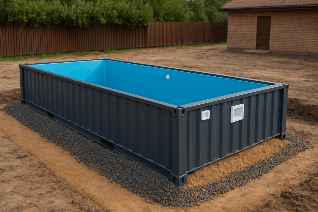 Контейнерный бассейн — это герметичная металлическая конструкция, изготовленная из модифицированного морского контейнера. Внутри он облицован прочным ПВХ-лайнером, оснащён системой фильтрации, подогрева и подсветки. Благодаря жёстким стенкам и усиленному каркасу, такая чаша не требует капитальной основы. Однако полностью игнорировать основание тоже нельзя — от него зависит долговечность и безопасность эксплуатации.